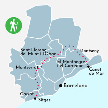 L’itinéraire part de la pittoresque ville côtière de Sitges, dans le Garraf, et se dirige vers l’intérieur des terres, en franchissant le massif du Garraf et en passant par le Penedès. Il relie ensuite les chaînes prélittorales de Montserrat, Sant Llorenç del Munt et Montseny avant de revenir vers la mer, en traversant le Montnegre-Corredor, pour aboutir dans la jolie cité balnéaire de Canet de Mar, dans le Maresme. Le GR 5 est un itinéraire très varié qui vous fera découvrir quelques-uns des nombreux attraits de la province de Barcelone : la mer et ses villages de pêcheurs, les montagnes côtières et prélittorales, si différentes les unes des autres, et les paysages vallonnés et agricoles du Penedès et du Vallès.